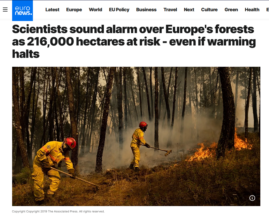 - Euronews Scientists sound alarm over Europe’s forests as 216,000 hectares at risk - even if warming halts (EN/IT/DE)